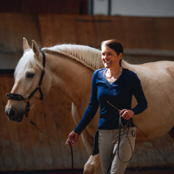– in aktiven Demonstrationen mit ihrem Pferd Tjardo. Gemeinsam mit Anne-Katrin Zwilling zeigt sie die Arbeit mit dem Karree zur Schulung von Balance, Geraderichtung, Versammlung und feiner Kommunikation.
